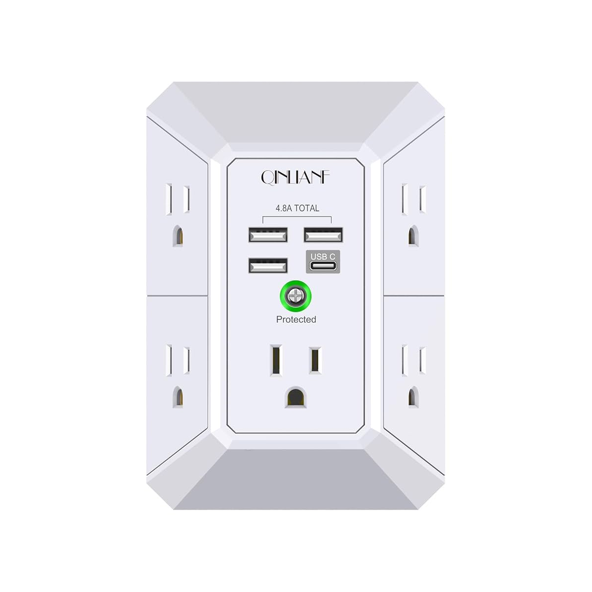 The QINLIANF HR‑519D is a wall-mounted surge protector and outlet extender. It plugs into a standard duplex wall socket and expands it into 5 AC outlets arranged across three sides, along with 4 USB charging ports, including one USB-C.