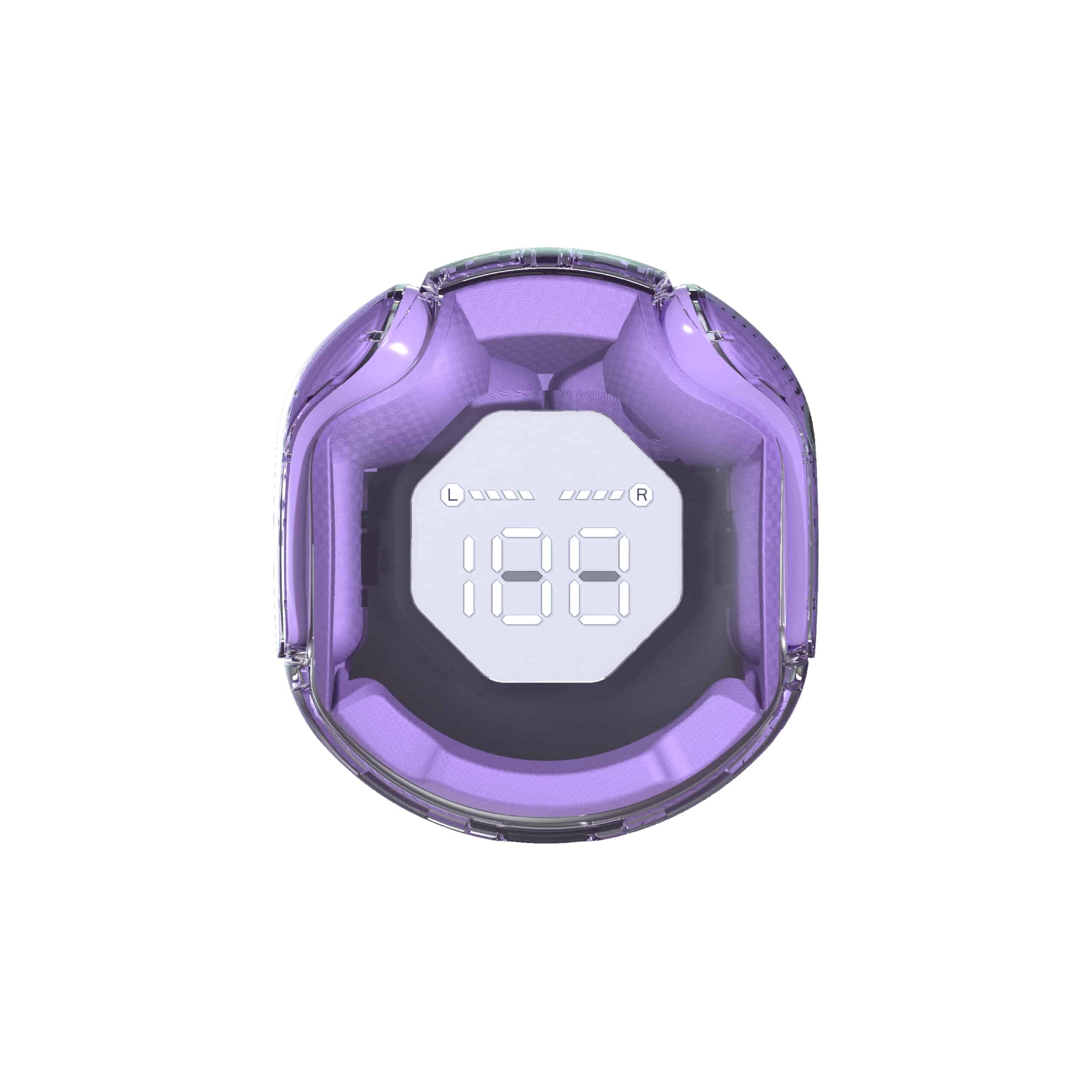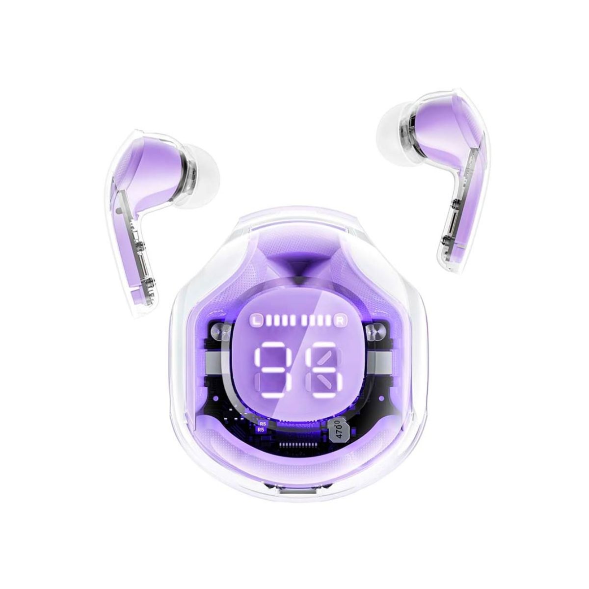 They’re true wireless earbuds with Bluetooth 5.3, good for about 7 hours of play on one charge. The charging case adds more time, and full charging takes ~2 hours. They use capacitive touch controls, support the usual Bluetooth profiles (HFP, A2DP, AVRCP), and have a frequency response of 20 Hz–20 kHz. The mic has a sensitivity around 38 dB. They come in violet (among other color options).