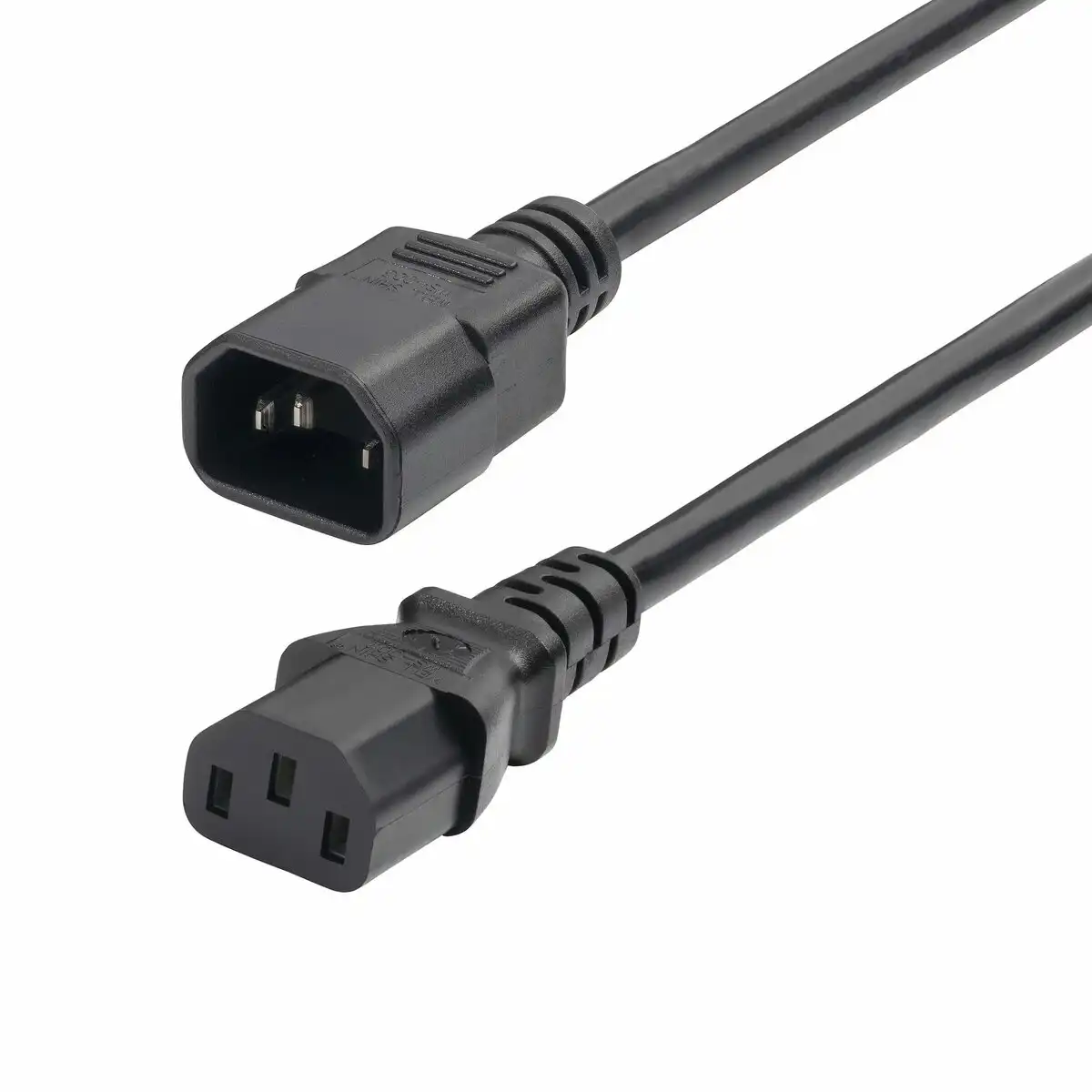 SPECS: 1ft (30cm); TAA Compliant; IEC 60320 C14 to IEC 60320 C13; 18AWG; 250V 10A (Max); Jacket Rating: SJT; Color: Black; Temperature Range: -4°F to 221°F (-20℃ to 105℃); Cable O.D.: 0.3in (7.8mm)