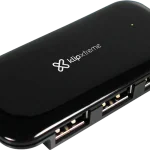 A compact black USB 3.0 hub with 4 USB‑A ports (up to 5 Gbps) that includes a USB‑C ⇄ USB‑A adapter and a micro‑USB input for extra power. Ideal for connecting multiple devices—perfect for travel or desktop setups.